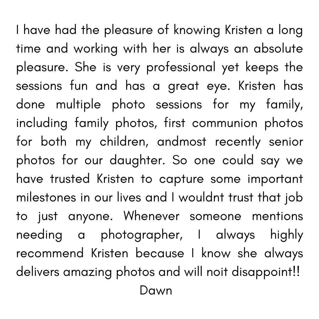 Kristen is a wonderful photographer and truly a professional in her field. She was instantly able to put my extremely shy teen at ease for his first ever photo shoot, and capture some truly amazing photographs. Her eye for a beautiful backdrop is amazing.We have four more boys coming up for their senior portraits in the next couple of years and look forward to having Kristen capture them as well. I simply cannot recommend her enough!